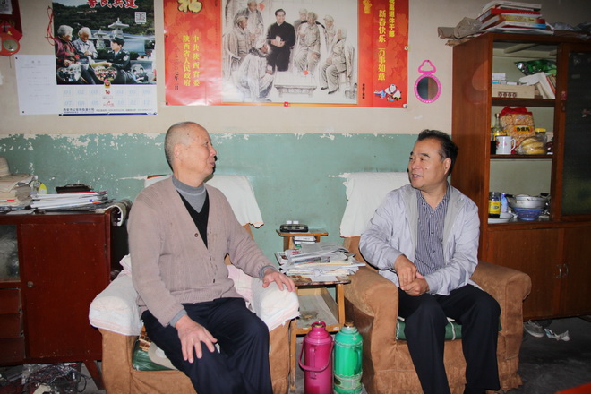 圖為隊(duì)黨委書記王戰(zhàn)社和退休職工劉明簡(jiǎn)親切交談