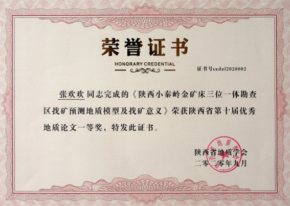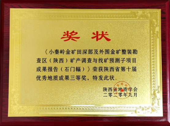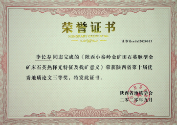 由我公司地調所編制完成的“小秦嶺金礦田深部及外圍金礦整裝勘查區(qū)(陜西)礦產調查找礦預測子項目(石門幅)成果報告”獲陜西省第十屆優(yōu)秀地質成果三等獎;張歡歡同志撰寫的“陜西小秦嶺金礦床三位一體勘查區(qū)找礦預測地質模型及找礦意義”獲優(yōu)秀地質論文一等獎;李長壽同志撰寫的“陜西小秦嶺金礦田石英脈型金礦床石英熱釋光特征及其找礦意義”獲優(yōu)秀地質論文三等獎。