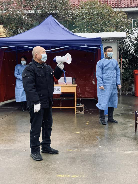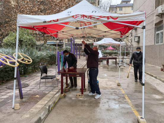 “微信運動幾萬步”,確保每棟樓、每個人做核酸。受疫情影響,大家不能出門,只能待在家里,然而,六隊志愿者日行萬步卻成為常態(tài)。代王基地設(shè)置了代東社區(qū)核酸點,西安基地設(shè)置了明園社區(qū)核酸點。每次核酸檢測志愿者都要與社區(qū)人員進(jìn)行對接,協(xié)調(diào)社區(qū)共計900人左右的核酸隊伍,維護(hù)現(xiàn)場秩序?!?2號樓一單元的同志,下樓做核酸了”、“15號樓3單元的同志,下樓做核酸了”,為防止人員聚集,造成交叉感染,院內(nèi)租住的用戶都是志愿者一樓一樓的叫下來的。代王基地院子內(nèi)一共10棟樓,360人,西安基地一共4棟樓,290人。為確保不漏一戶、不漏一人,志愿者每次都要一次次的繞著院子來回的“喊”。除此之外,志愿者要在核酸檢測人員來之前擺好核酸檢測設(shè)施,拉好警戒線,連接網(wǎng)絡(luò)專線、通電、安裝照明燈,一片都不漏的對場地以及進(jìn)院子的人員進(jìn)行徹底消殺。在核酸檢測結(jié)束,人員離開場地后,志愿者仍然堅守在崗位上,因為他們還要將醫(yī)用垃圾專員清理拉走,再次對場地及人員做一次徹底消殺。在維護(hù)核酸檢測隊伍秩序時,面對不理解、抱怨聲,他們選擇用真情感染者每家每戶。